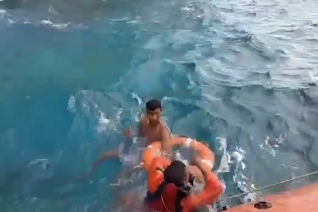 Namun setelah seorang anggota Basarnas terjun ke laut dan membawa pelampung, korban diminta terjun dan diselamatkan.