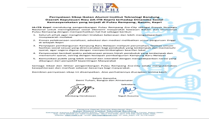 Pernyataan sikap itu diterima redaksi, Minggu (10/11/2023) dan melalui Ketua IA-ITB Kepri Bambang hendrawan mengatakan, IA-ITB Kepri mendukung pengembangan Pulau Rempang Eco-City sebagai Proyek Strategis Nasional untuk meningkatkan sosial ekonomi masyarakat kawasan Batam dan khususnya Pulau Rempang.