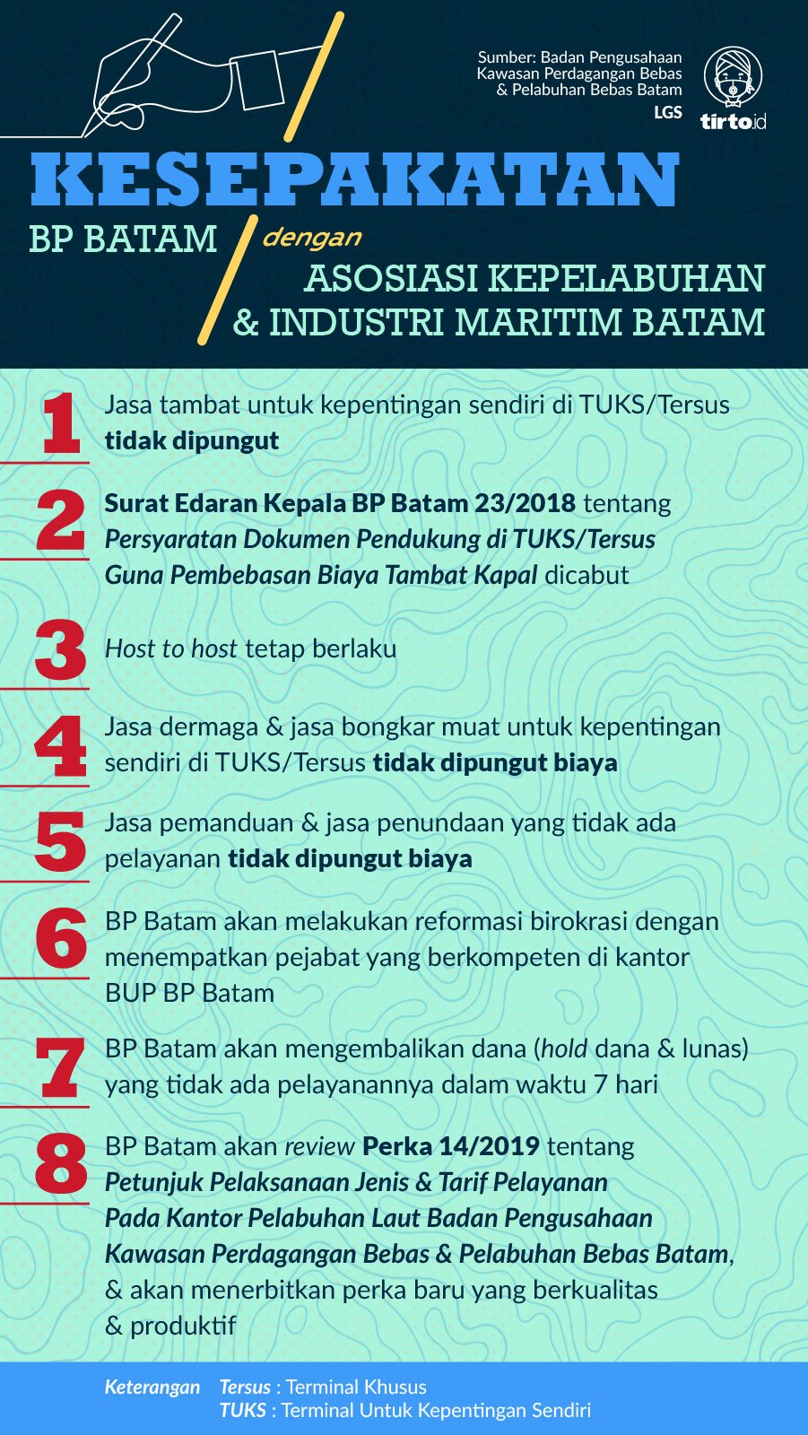 Pertemuan BP Batam dengan asosiasi perusahaan pelayaran itu menghasilkan beberapa poin kesepakatan. Di antaranya, pada akhirnya pemungutan biaya jasa Tambat Untuk Kepentingan Sendiri (TUKS) dihapuskan. Selain itu kesepakatan mencabut Surat Edaran (SE) Kepala Kantor Pelabuhan Laut BP Batam 23/2018, terkait persyaratan dokumen pendukung Tersus dan TUKS. BP Batam juga berjanji akan mengembalikan hold dana yang tidak ada pelayanan jasa tunda dan pandu, dalam waktu tujuh hari.