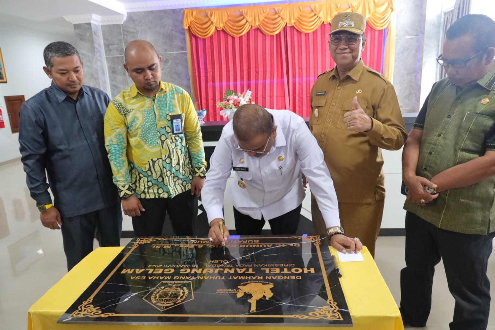 “Atas nama Pemerintah Kabupaten Karimun selaku KPM di BUP mengucapkan terima kasih dan apresiasi kepada Direktur, Komisaris dan segenap jajarannya yang telah membangun Hotel Tanjung Gelam ini,” ucap Bupati.