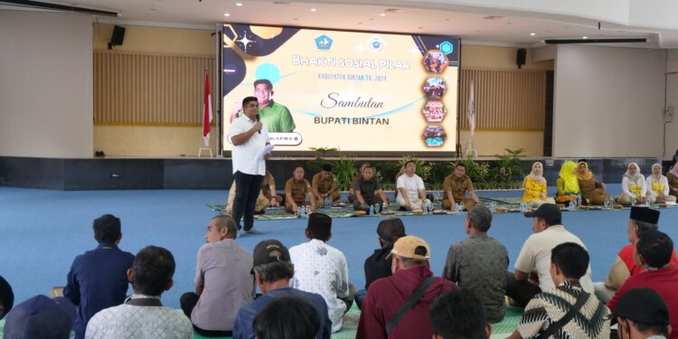 BINTAN – Bupati Bintan Roby Kurniawan seharian penuh berkeliling di tiga titik lokasi penyerahan sembako. Didampingi Ketua Lembaga Koordinasi Kesejehteraan Sosial (LKKS) Bintan Hafizha Rahmadhani dan Pilar-Pilar Sosial, Bupati Roby menyerahkan 2.200 paket sembako yang ditujukan bagi sembilan Kecamatan.