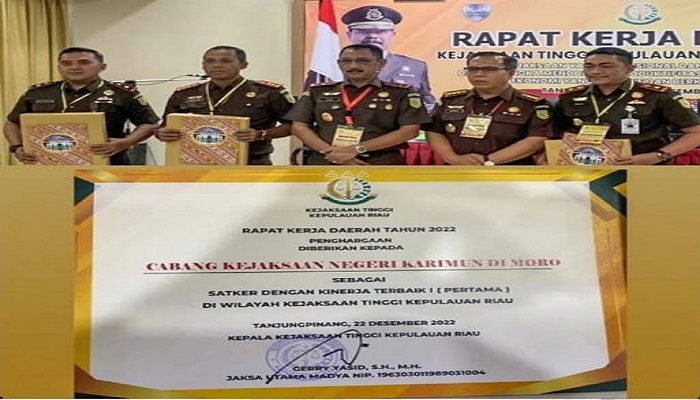 Dalam kegiatan rakerda tersebut kepala cabang kejaksaan karimun di Moro menerima penghargaan peringkat Pertama di wilayah kejaksaan tinggi kepri dari Kajati Gerry yasid atas capaian kinerja tahun 2022.