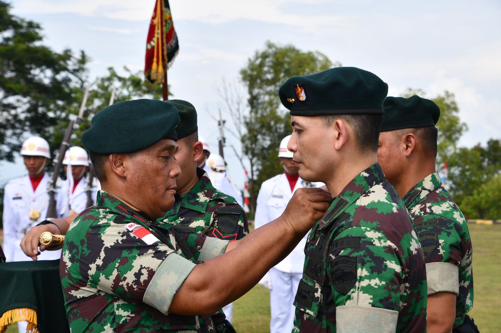 Prosesi upacara Sertijab Komandan Yonif Raider Khusus 136/TS ditandai dengan penyematan pangkat dan tanda jabatan.