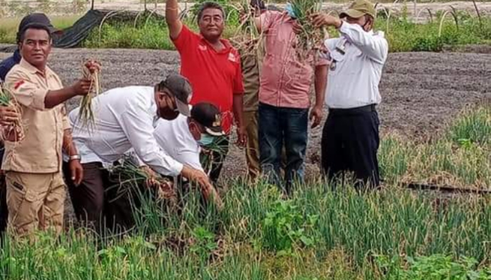 KEPRIONLINE CO.ID, KARIMUN- Dalam kesempatan ini Kepala Dinas Pertanian Kabupaten Karimun Bapak Suriyanto Jaya Putra turun langsung ke lokasi pertanian Bawang merah milik saudara Topan warga kelurahan Moro timur