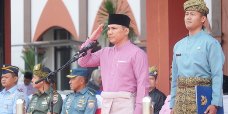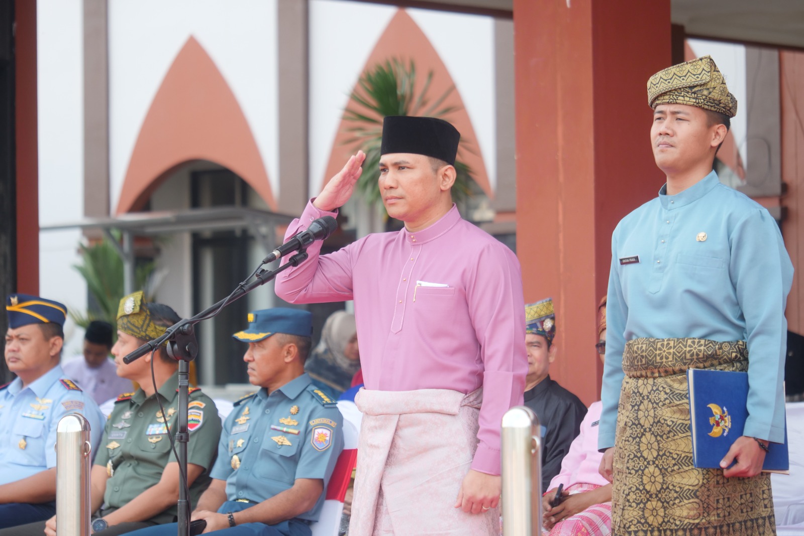 Wakil Bupati Bintan Ahdi Muqsith yang bertindak sebagai Pembina Upacara terlihat kompak bersama seluruh peserta mengenakan pakaian Kurung Melayu lengkap bersongket dan bertanjak.