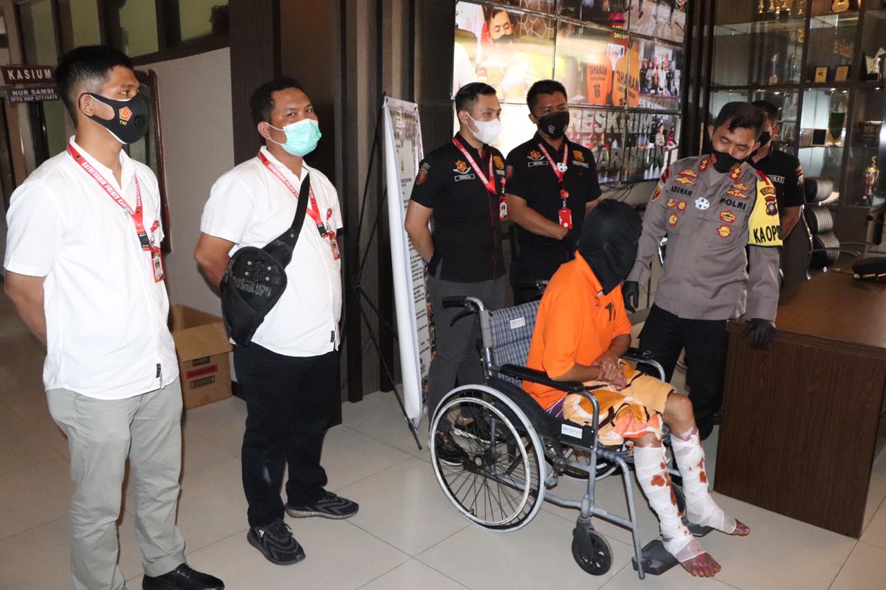 Pelaku DH (29 Tahun) dalam keadaan terduduk diatas roda tertunduk lesu didepan awak media, pelaku melakukan Pembobolan ATM dengan modus melakukan pembakaran yang kemudian melakukan aksi pencurian uang di mesin ATM tersebut senilai hasil kejahatan yang dilakukan pelaku pihak Bank mengalami kerugian seniai Rp.861.400.000 (delapan ratus enam puluh satu juta empat ratus ribu rupiah).