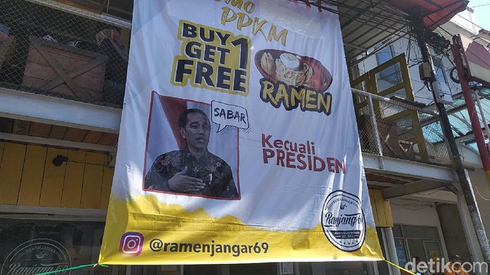 “Merdeka! Promo PPKM buy 1 get 1 free ramen. Kecuali Presiden,” demikian bunyi pesan dalam baligo tersebut.