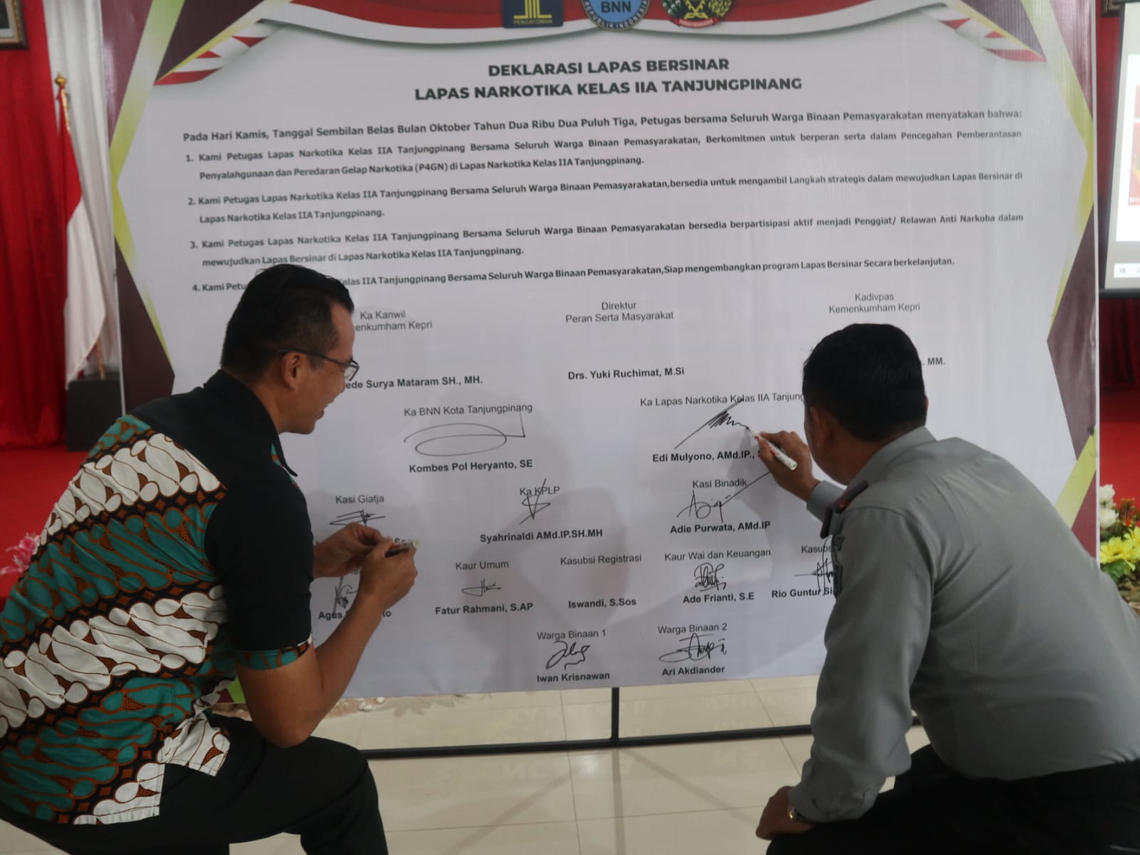 Kepala Divisi Pemasyarakatan (Kadivpas) Kanwil Kemenkumham Kepri, Dwinastiti mengatakan bahwa, Deklarasi ini merupakan instruksi Presiden Nomor 2 Tahun 2020, tentang rencana aksi nasional pencegahan dan pemberantasan penyalahgunaan dan peredaran narkoba tahun 2020-2024.