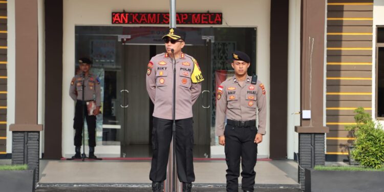 Kapolres Bintan, AKBP Riky Iswoyo pimpin apel pagi dalam persiapan pelaksanaan Pilkada 2024, Rabu 24 Juli 2024.