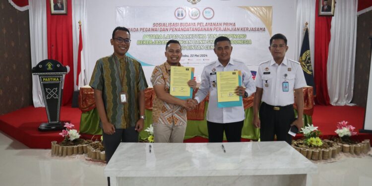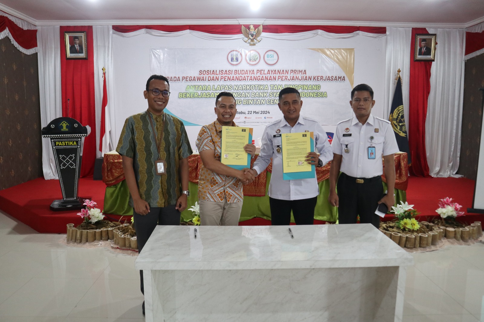 BINTAN – Lapas Narkotika Tanjungpinang terima sosialisasi pelayanan prima dan penandatanganan perjanjian kerjasama (pks) bersama Bank Syariah Indonesia (BSI) Cabang Bintan Center.