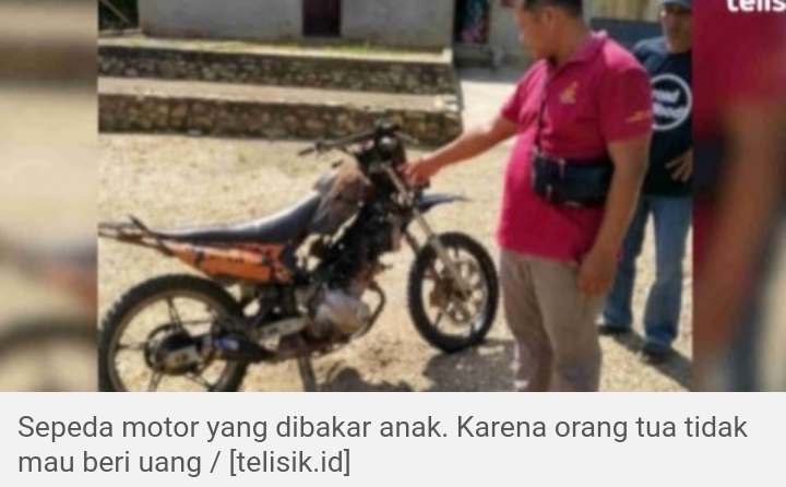 Untuk melampiaskan kemarahannya, anak bernama Bota membakar sepeda motor milik ayahnya. Tidak hanya itu, pelaku juga hampir menebas ayah dan ibunya dengan parang.