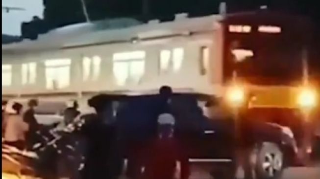KEPRIONLINE.CO.ID, NASIONAL – Sebuah mobil jenis mini SUV, terlihat tiba-tiba berhenti di tengah lintasan Kereta Rel Listrik (KRL), saat bersamaan, lonceng tanda kereta akan melintas nyaring berbunyi, suasana petang yang tegang di perlintasan KRL Kalibata.