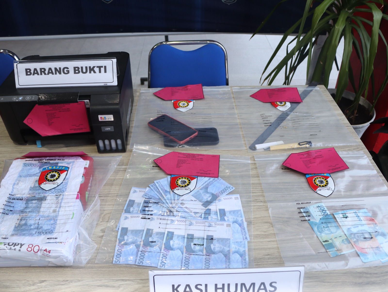Barang bukti yang diamankan oleh Satreskrim Polres Karimun yakni 1 (satu) unit Printer Merk Epson Seri L3210, 1 (satu) buah penggaris, 1 (satu) buah pisau cutter, lembaran kertas HVS ukuran A4, 34 (tiga puluh empat) lembar uang palsu pecahan Rp. 50.000 (lima puluh ribu rupiah), 3 (tiga) lembar uang asli pecahan Rp. 50.000 (lima puluh ribu rupiah), 1 (satu) unit sepeda motor merk scopy warna hitam BP 3722 KI, 1 (satu) unit handphone merk oppo A15 warna biru, 1 (satu) unit handphone merk redmi warna biru.