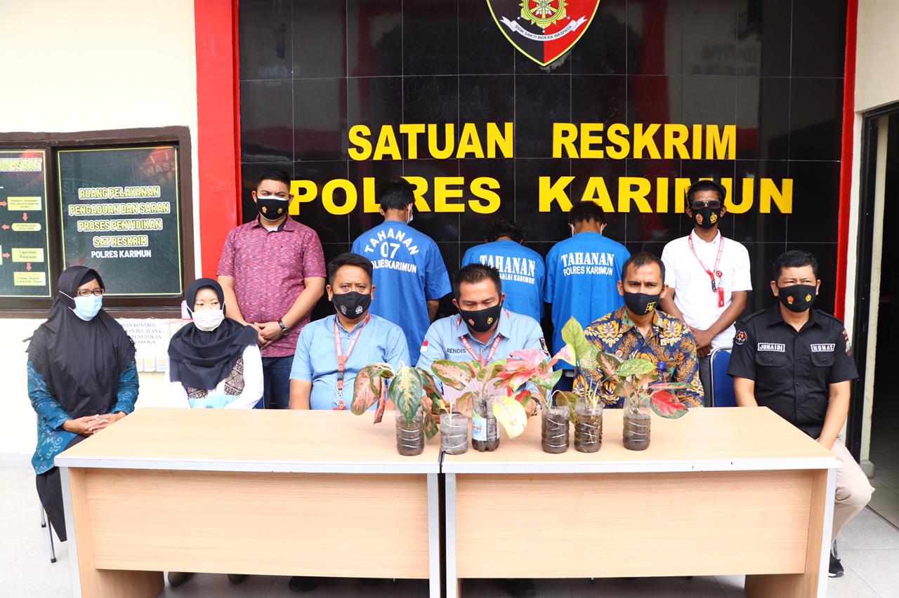 KEPRIONLINE,CO,ID,KARIMUN – Polres Karimun Polda Kepri mengungkap kasus pencurian yang dilakukan EH (39 Tahun) dengan menyuruh kedua pelaku lainnya FK (16 Tahun) dan GR (16 Tahun) untuk melakukan aksi pencurian Bunga Keladi Merah di Jalan Telaga Riau RT 004 RW 005 Kel. Sei Lakam Kec. Karimun Kab. Karimun Prov. Kepri. Kamis (11/02/2021).