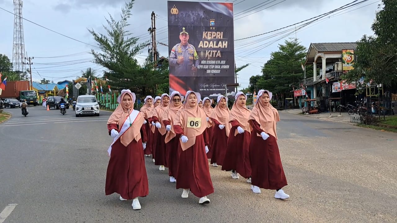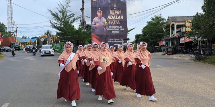 BINTAN – 16 tim emak-emak majelis taklim ramaikan gerak jalan di Jalan Nusantara Km 18 Kijang, Kecamatan Bintan Timur, Kabupaten Bintan.