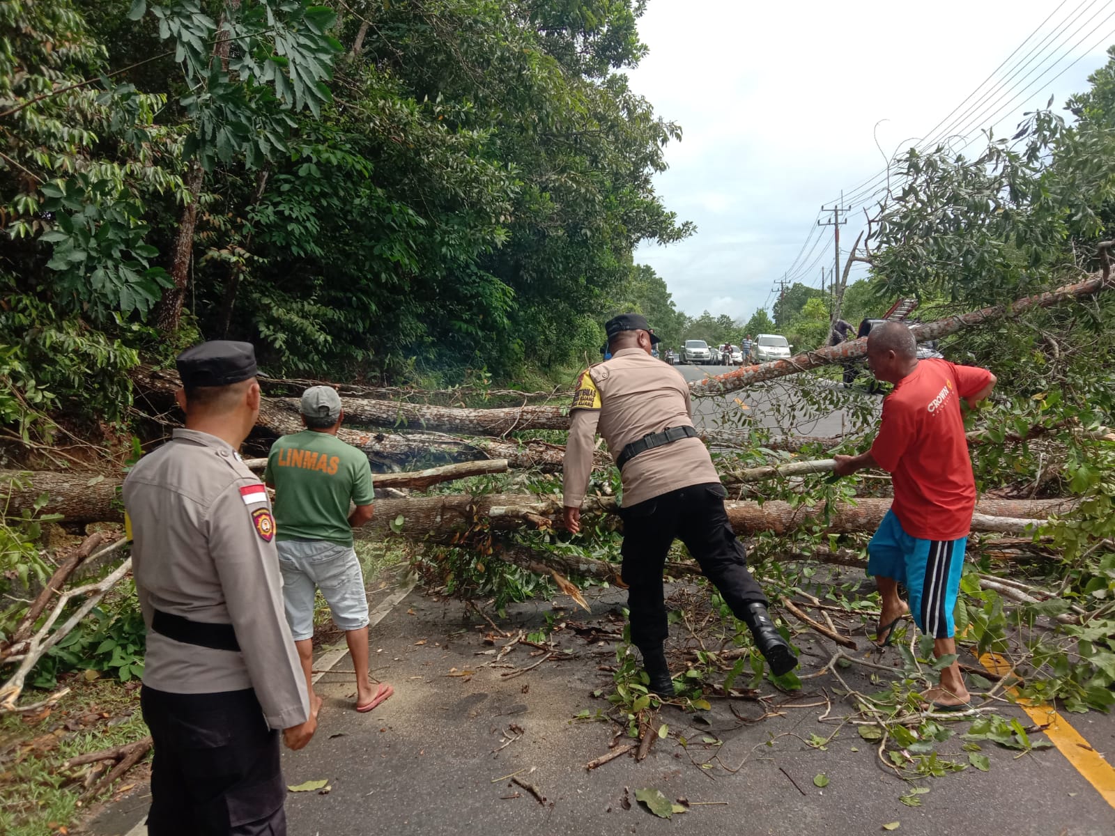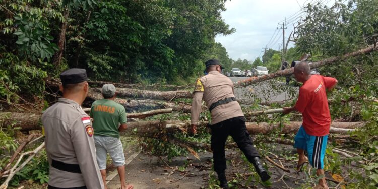 “Informasi itu dari warga melalui Bhabinkamtibmas, menyikapi itu kita kerahkan personil untuk melakukan pembersihan pohon yang tumbang, ” kata AKP Satri Putra.