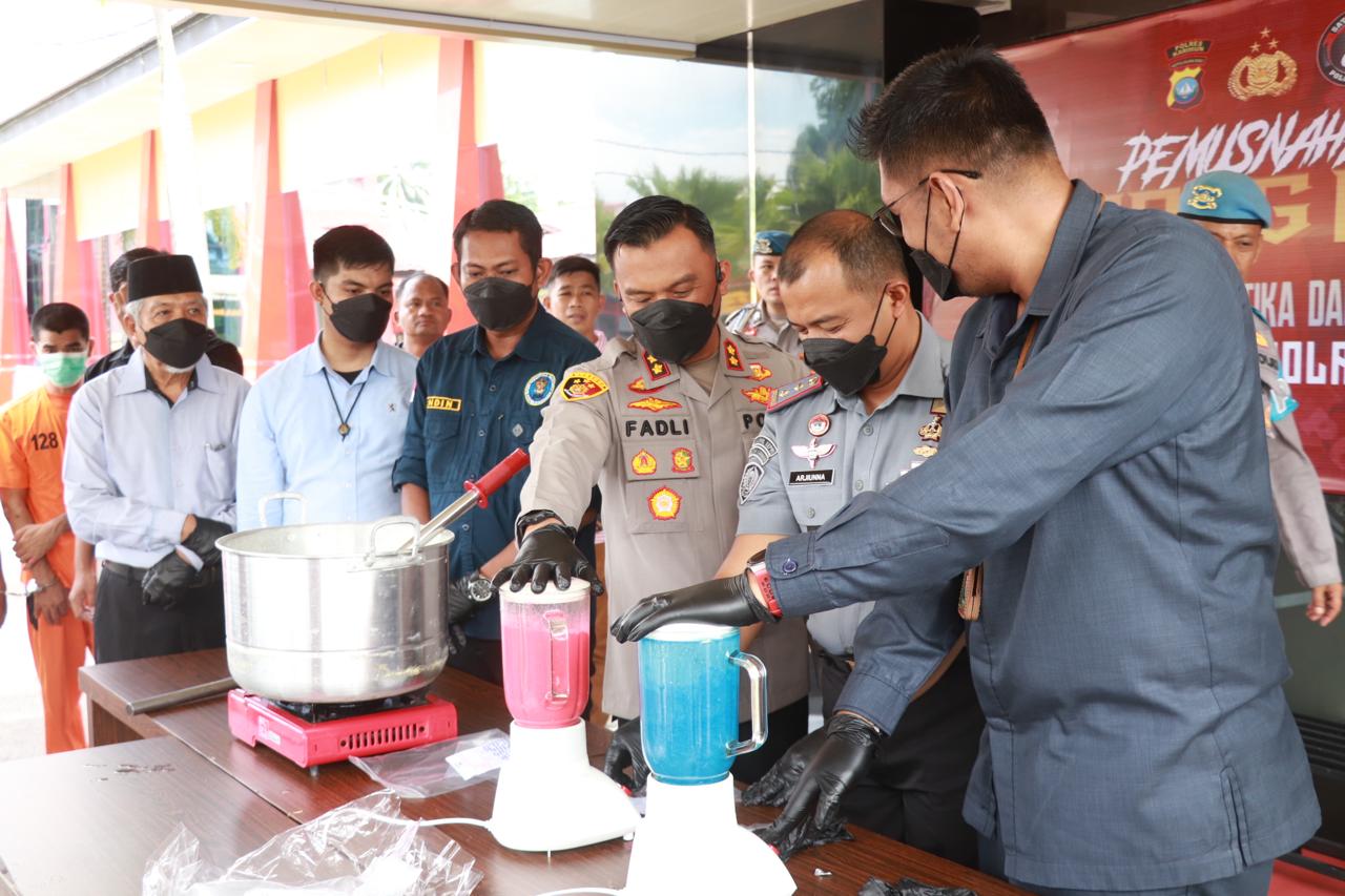 “Pemusnahan barang bukti ini kita lakukan dengan cara memasukan barang bukti tersebut kedalam tempat yang berisikan air mendidih kemudian dilarutkan dan untuk pil Ekstasi di masukkan didalam blender dan di hancurkan selanjutnya barang bukti tersebut dibuang kedalam saluran pembuangan yang ada di Polres Karimun,” ungkap Kapolres Karimun AKBP Fadli Agus, S.I.K., M.H.