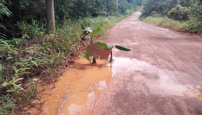 KEPRIONLINE.CO.ID, LINGGA – Dua pohon pisang di tanam warga di ruas jalan antara Desa Sungai Buluh menuju jalan Desa Jagoh Kecamatan Singkep Barat Kabupaten Lingga, aksi warga itu wujud protes terhadap rusaknya jalan penghubung antar Desa yang terjadi sudah sekian tahun.