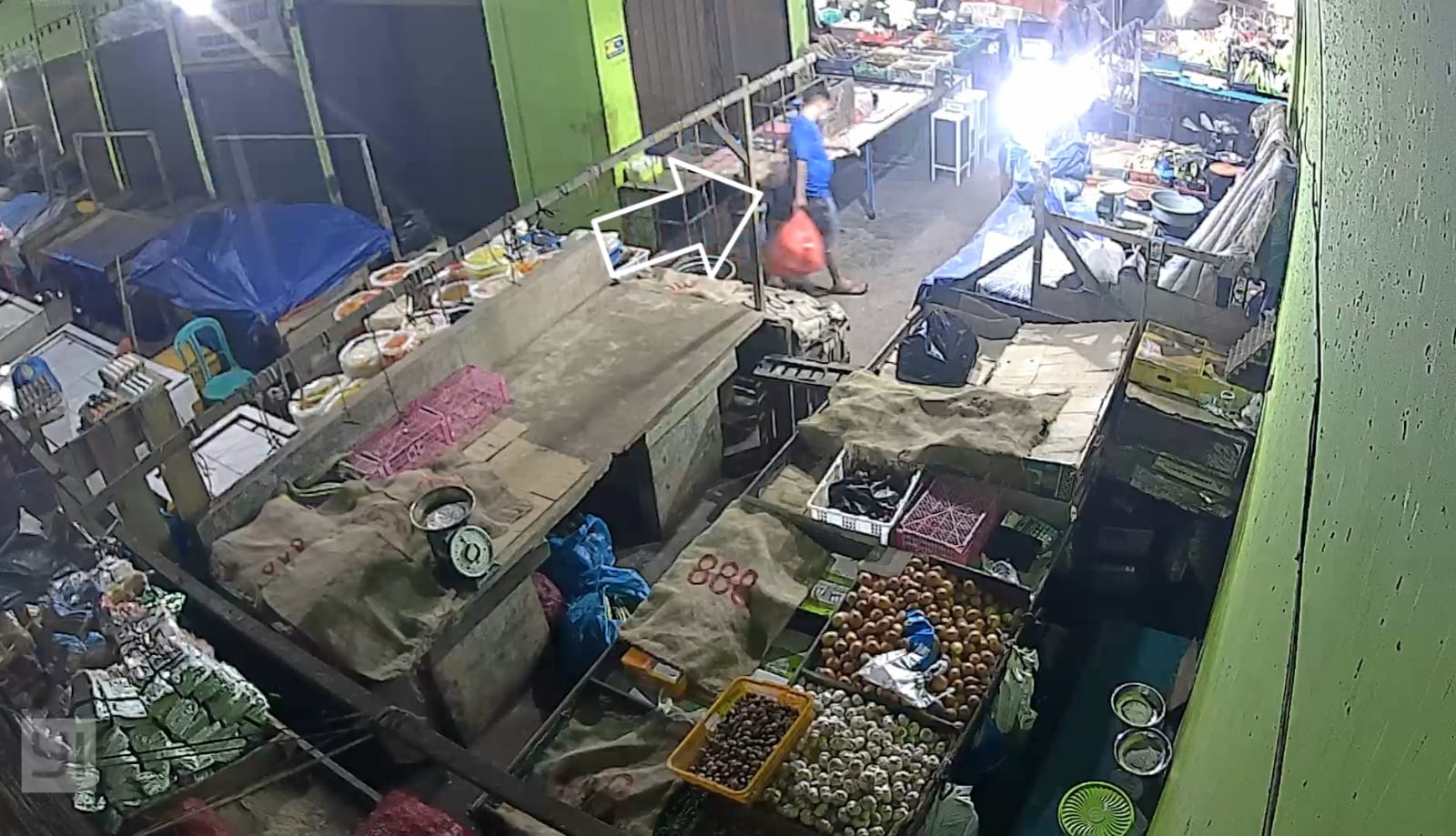 Potret Pelaku Berbaju Biru Menenteng Ayam Potong Seberat 100 Kg Terekam CCTV di Pasar Barek Motor Kijang.