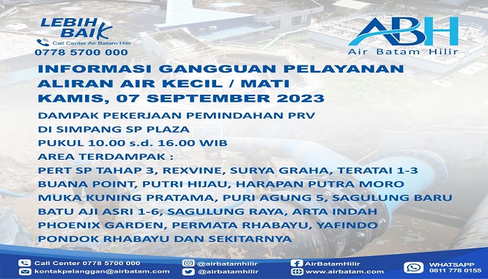 Dalam rilis resmi yang diterima media Keprionline.co.id, Air Batam Hilir menginformasikan adanya pekerjaan pemindahan PRV yang bertujuan untuk meningkatkan suplai ke pelanggan yang berlokasi di Simpang SP Plaza, Batu Aji.