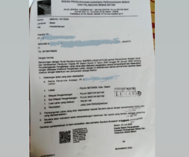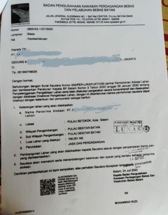 Seperti diketahui Lahan seluas 70 Ha di jembatan 3 setokok tersebut diketahui untuk peruntukan kegiatan jasa dan perdagangan. Lahan tersebut di alokasikan berdasarkan surat saudara nomor 002/Per-LI/KAP/JKT/II/20. Perihal permohonan alokasi lahan dan berdasarkan peraturan kepala BP-Batam nomor 3 tahun 2020 tanggal 29 Januari 2020 tentang penyelenggaraan pengalokasian lahan, serta telah di lakukan pengecekan secara komperhensif dan di sesuaikan dengan data base Direktorat pengelolaan lahan. Dengan ini permohonan saudara dapat di setujui dengan ketentuan dan persyaratan, pada isi surat tersebut. Ucap Tohom