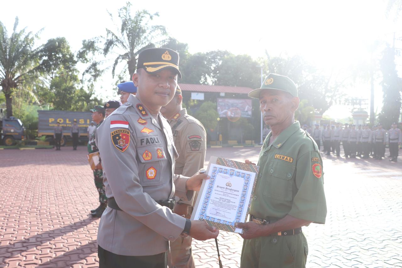 Kapolres Karimun AKBP Fadli Agus memberikan penghargaan kepada instansi vertikal dan satu orang linmas.